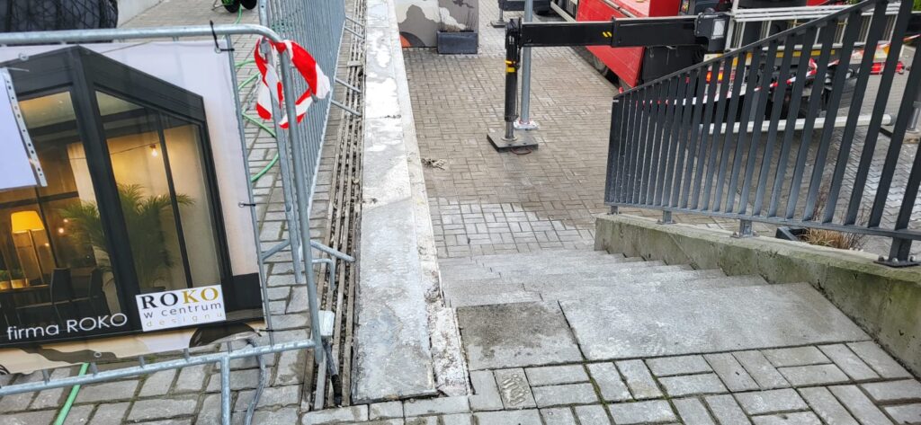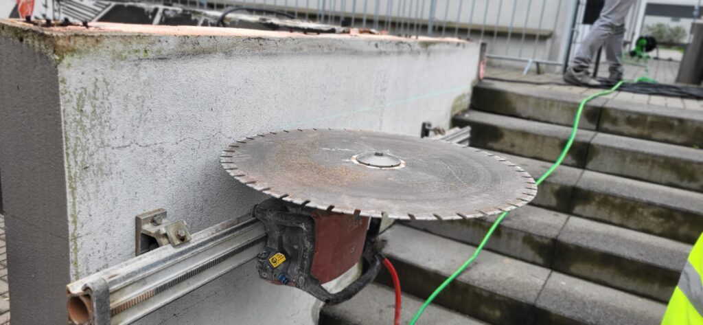 Do tego zadania wykorzystano specjalistyczny sprzęt do cięcia betonu, dzięki czemu wyspecjalizowana firma mogła precyzyjnie usunąć fragmenty murków po obu stronach wejścia.