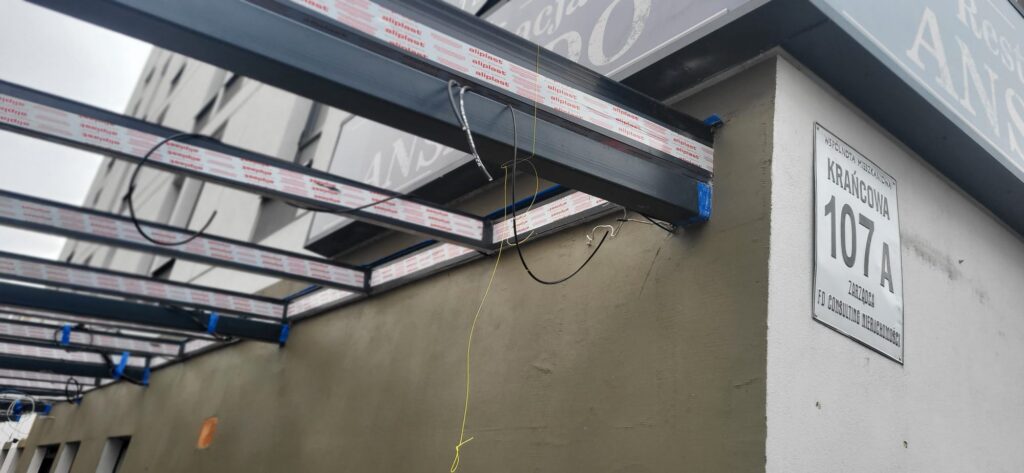 Następnie przyszedł czas na kluczowy etap – montaż konstrukcji stalowej, która stała się głównym elementem nośnym całej realizacji. To właśnie ona umożliwiła zamocowanie: